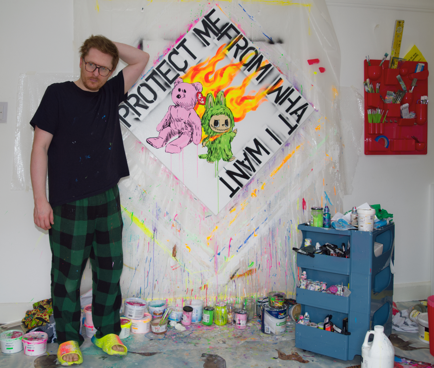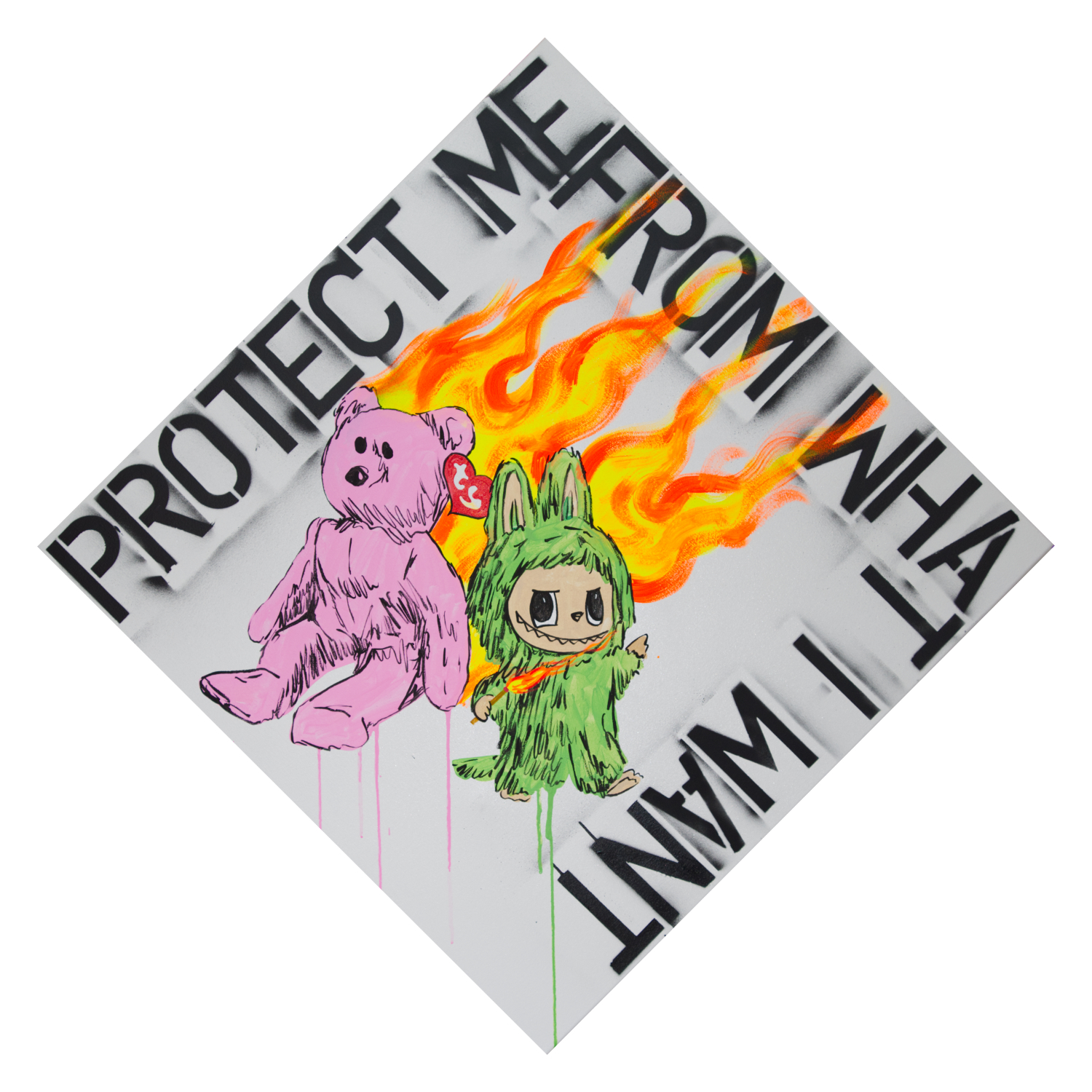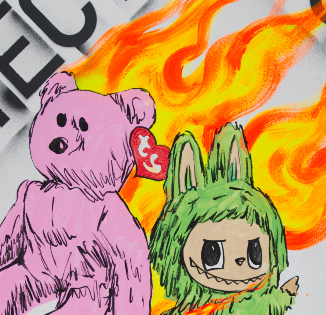 Au centre, deux icônes de la culture des jouets apparaissent : une peluche Ty Beanie Baby, autrefois objet de spéculation, et un Labubu, créature hybride et culte du design contemporain. Derrière eux, des flammes jaillissantes viennent troubler l’univers enfantin et coloré qu’ils incarnent.